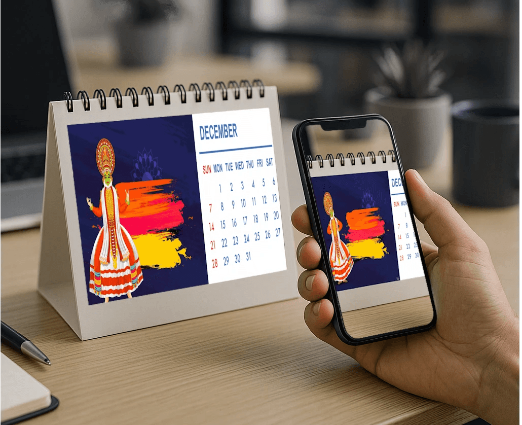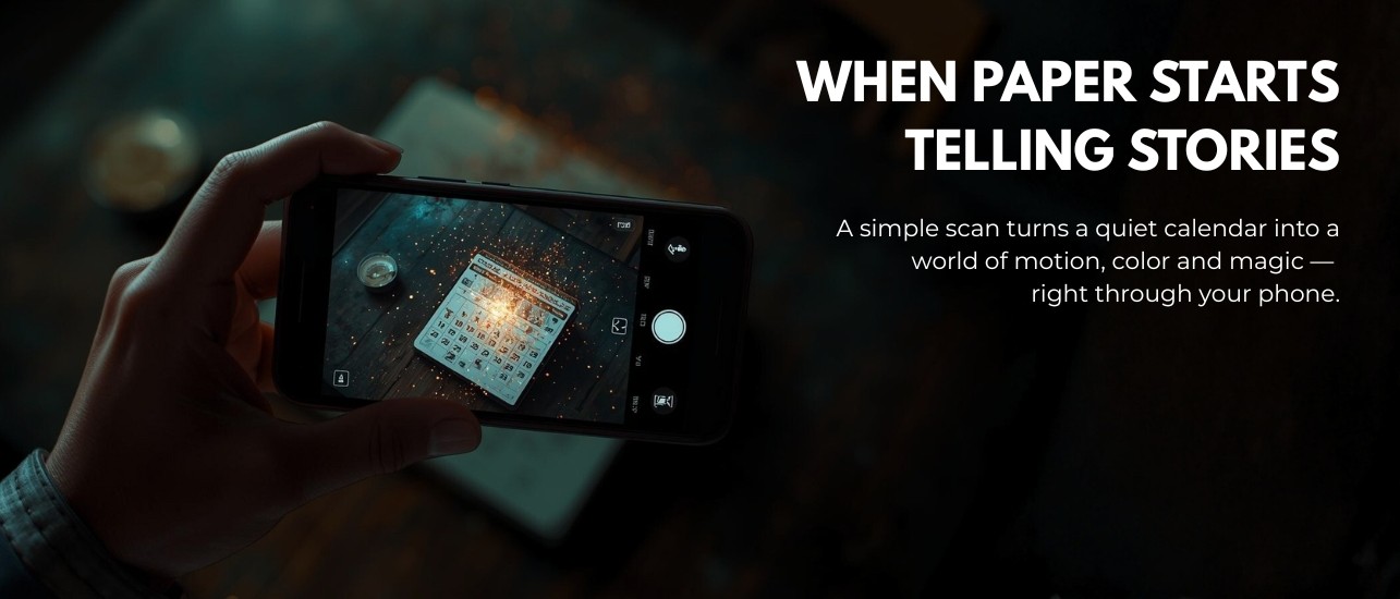 A 12-month calendar that's like an art till you scan the magical QR code on it. Once scanned it turns each month into a mixed-reality portal to interactive and immersive storytelling with video, 3D, sound, and everything in between.